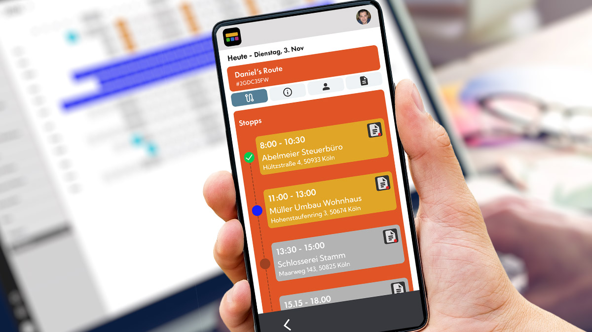 Alle Einsätze und Routen mit mehreren Kunden übersichtlich im Zeitverlauf. Freie Zeitfenster erkennst du sofort und kannst dort weitere Einsätze schnell und einfach einfügen.