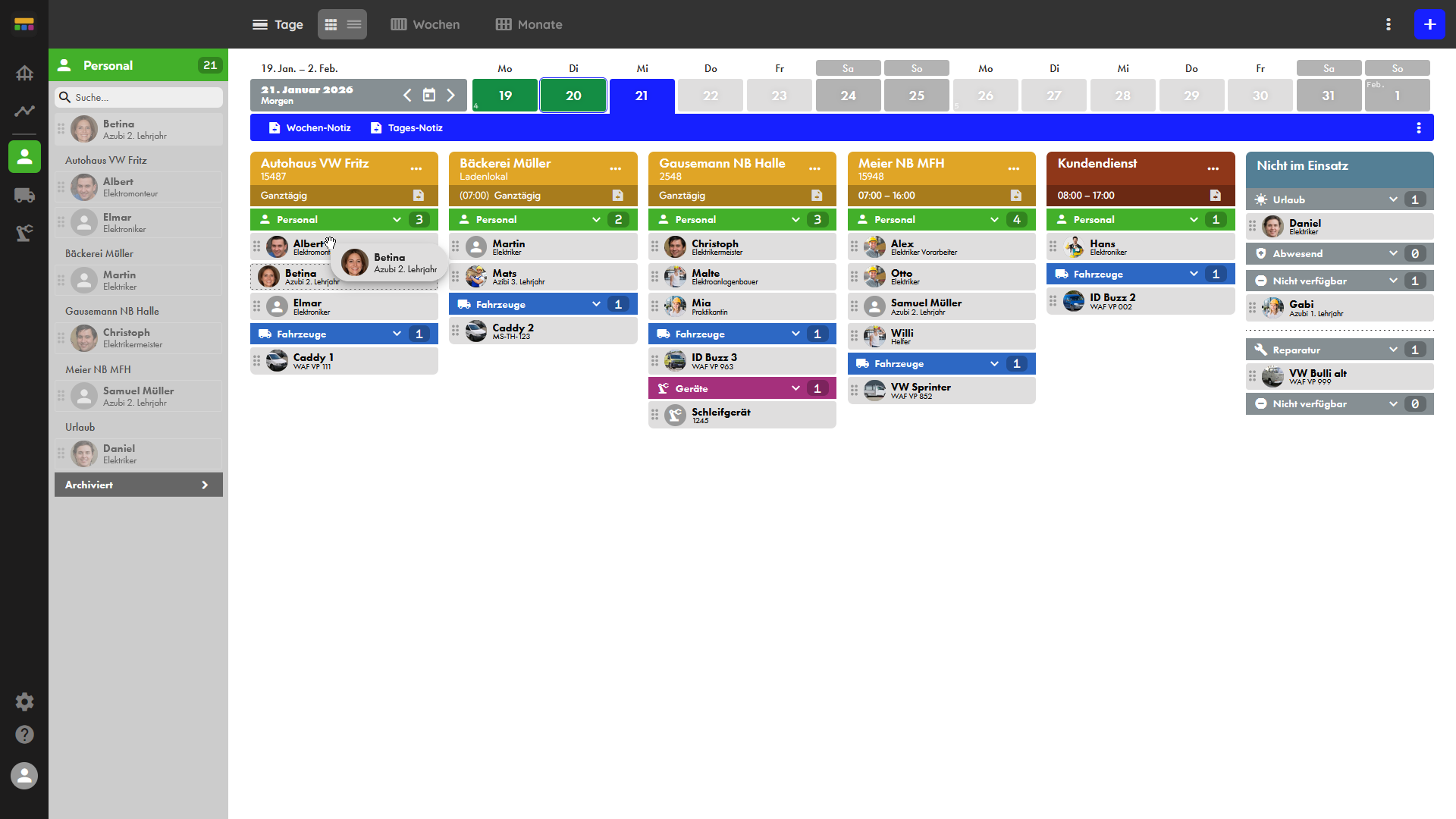 Deine Tagesplanung auf einen Blick. Hier hast du den kompletten Überblick und siehst wer wo eingeteilt ist. Unvorhergesehene Änderungen? Kein Problem: Du änderst per Drag & Drop.