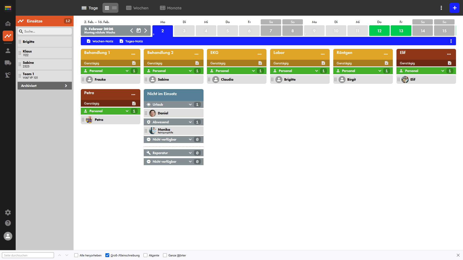 Deine Tagesplanung auf einen Blick. Hier hast du den kompletten Überblick und siehst wer wo eingeteilt ist. Unvorhergesehene Änderungen? Kein Problem: Du änderst per Drag & Drop.
