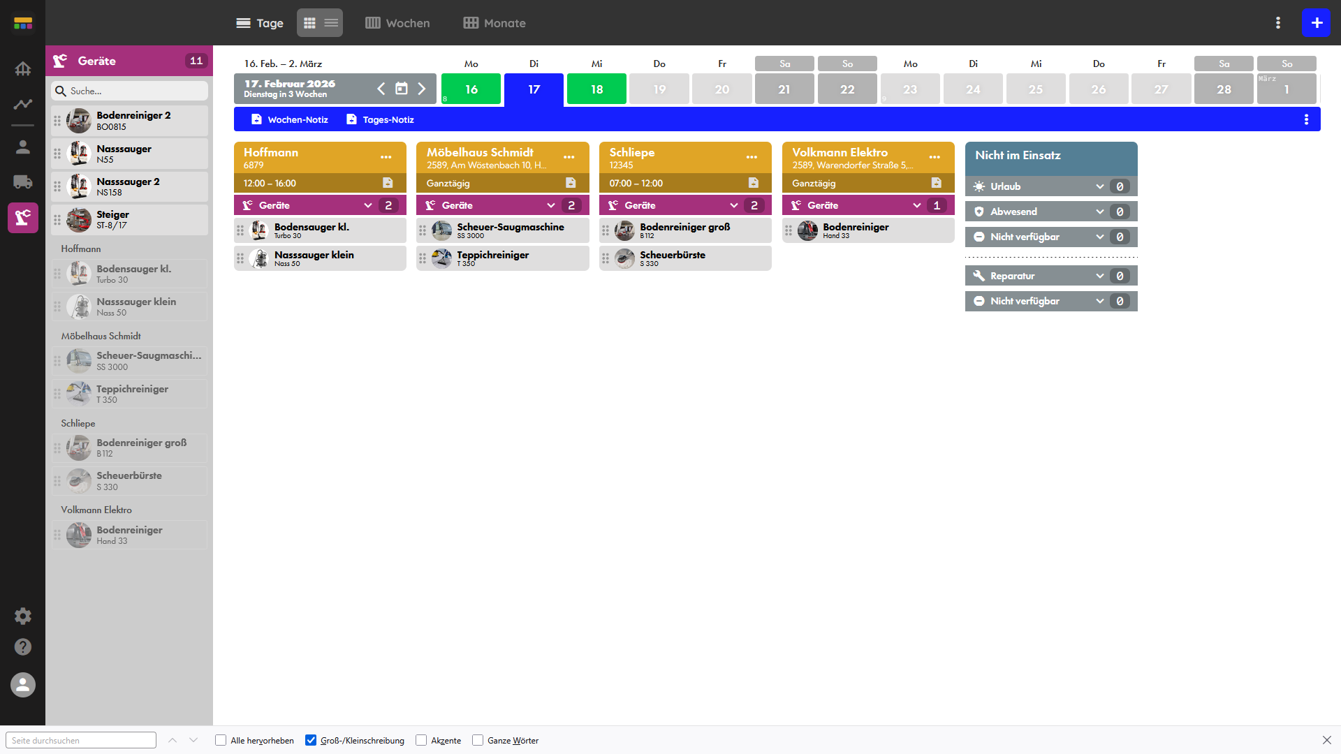 Infos, Kontakte, Fotos und Dokumente sind direkt beim Auftrag hinterlegt. Urlaube und Abwesenheiten werden automatisch berücksichtigt.