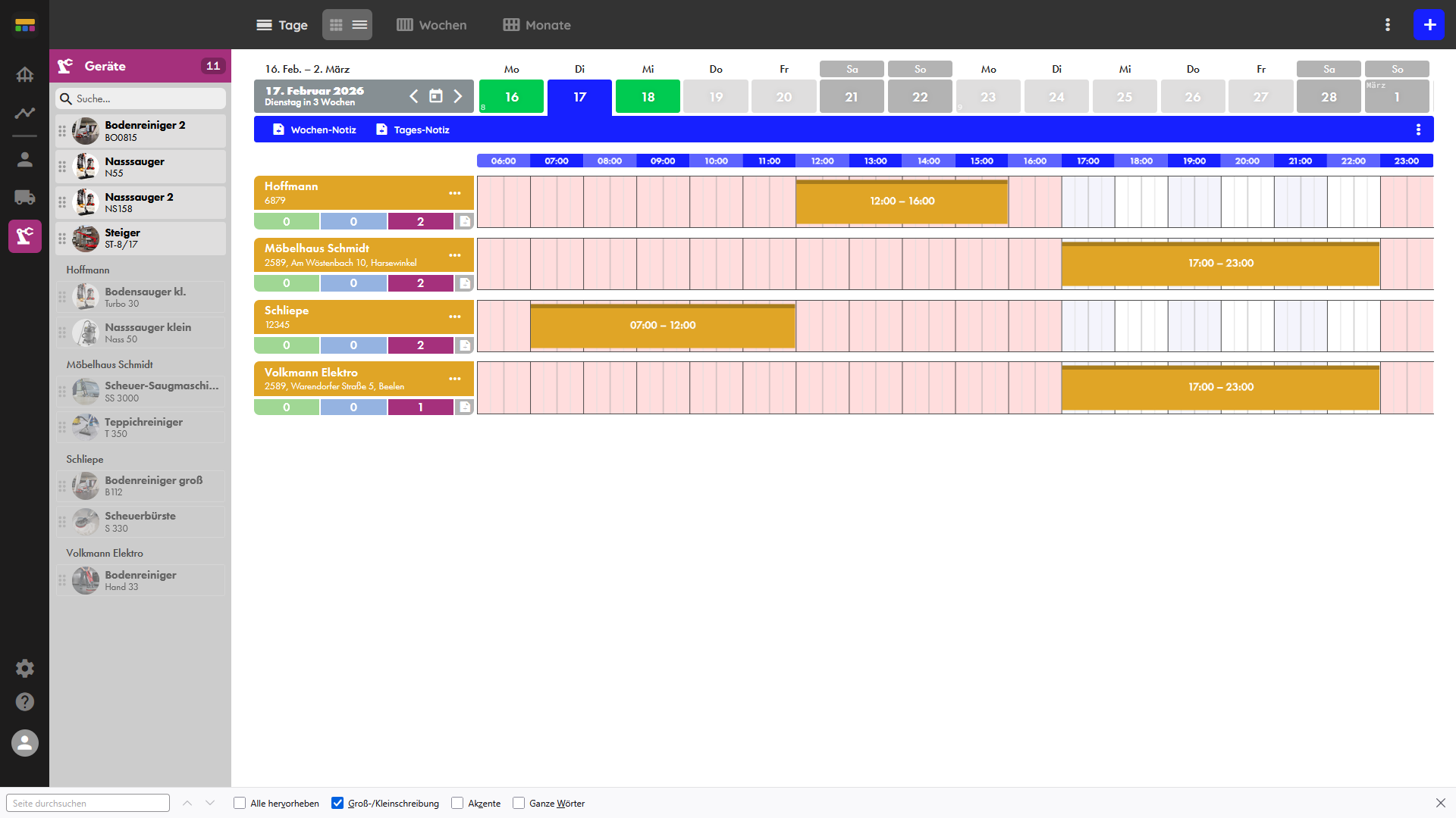 Alle Einsätze und Routen mit mehreren Kunden übersichtlich im Zeitverlauf. Freie Zeitfenster erkennst du sofort und kannst dort weitere Einsätze schnell und einfach einfügen.